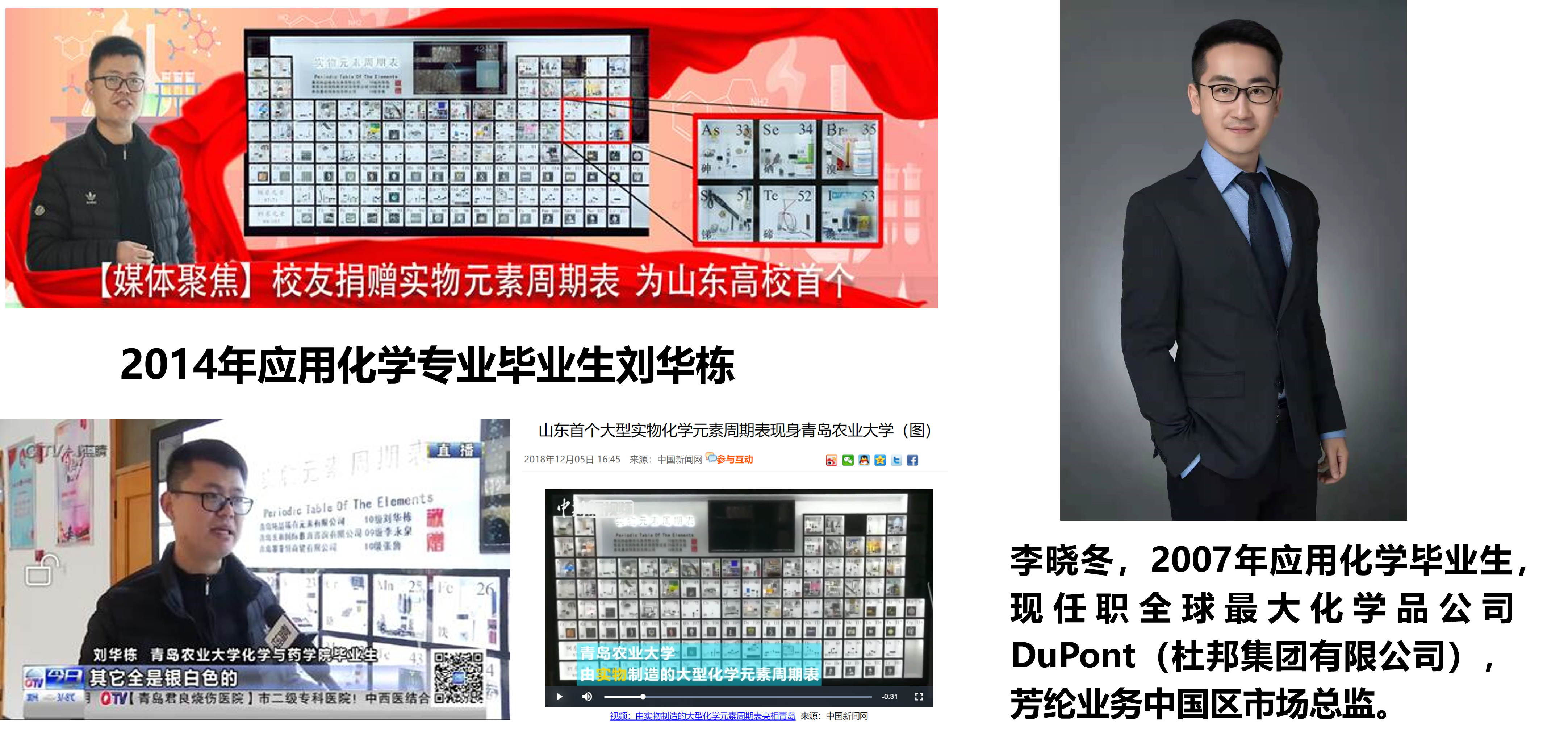 2014届应化专业毕业生刘华栋,毕业后凭借较强的专业功底开始了自主创业,目前已注册成立青岛纯晶稀有元素有限公司,从事于稀有元素的制备,客户包括科普馆、博物馆、大学实验室、研究所等。公司十周年院庆,他无偿捐赠实物元素周期表为山东省首个大型实物化学元素周期表,曾获得媒体的广泛关注和报道。李晓冬,bw西汉姆联应用化学专业2007届毕业生,现任职于全球最大化学品公司DuPont(杜邦集团有限公司),芳纶业务中国区市场总监。