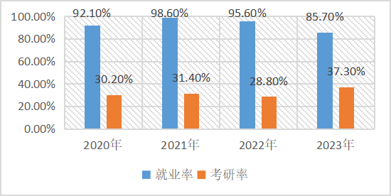 近四年就业率均超92%,2024年截止6月1日就业率达90.91%,考研率逐年提升,2025年升学率达到47.3%。