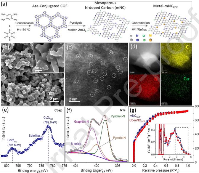 图2. 催化剂制备过程示意图和结构表征。(a)Co-mNCCOF催化剂的制备过程示意图,(b)扫描电子显微镜照片,(c)球差校正高角暗场透射电子显微镜照片,(d)能量散射谱元素分析,(e)Co2p局域XPS谱图,(f)N1s局域XPS谱及分峰谱图,(g)mNCCOF材料配位Co2+前后的N2吸脱附曲线及局域孔径分布图。