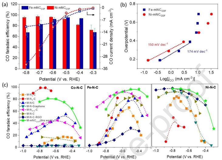图4. Fe-mNCCOF及Ni-mNCCOF催化剂在0.5M KHCO3溶液中的CO2电催化还原性能(a)及Tafel分析(b),(c)本文三种催化剂与文献报道的用统一方法所制备的三种M-N-C催化剂的CO 选择性对比。