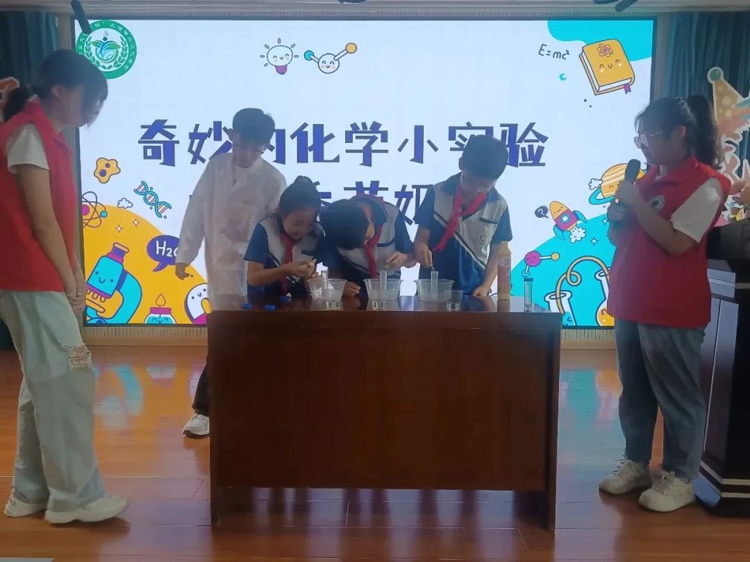仪式结束后,在马永超老师的参与下,bw西汉姆联“锌”火相传小小化学家社团的成员们开展了一系列科普活动,以寓教于乐的方式,让孩子们近距离感受化学的魅力。社团成员以反式脂肪酸为主题的化学科普作为开场,生动有趣的画面和简单易懂的解说,让孩子们在轻松愉快的氛围中了解了反式脂肪酸的概念、来源以及危害,互动问答环节进一步帮助孩子们巩固所学知识。紧接着,“香草奶昔”化学小实验将活动推向高潮。在社团成员的指导下,孩子们亲自动手操作,依次向烧杯中滴入色素、洗洁精、白醋、小苏打,并亲眼见证泡沫喷涌的神奇瞬间。通过亲身体验和互动,孩子们对化学有了更深的认识和理解,也感受到了科学的神奇与魅力。