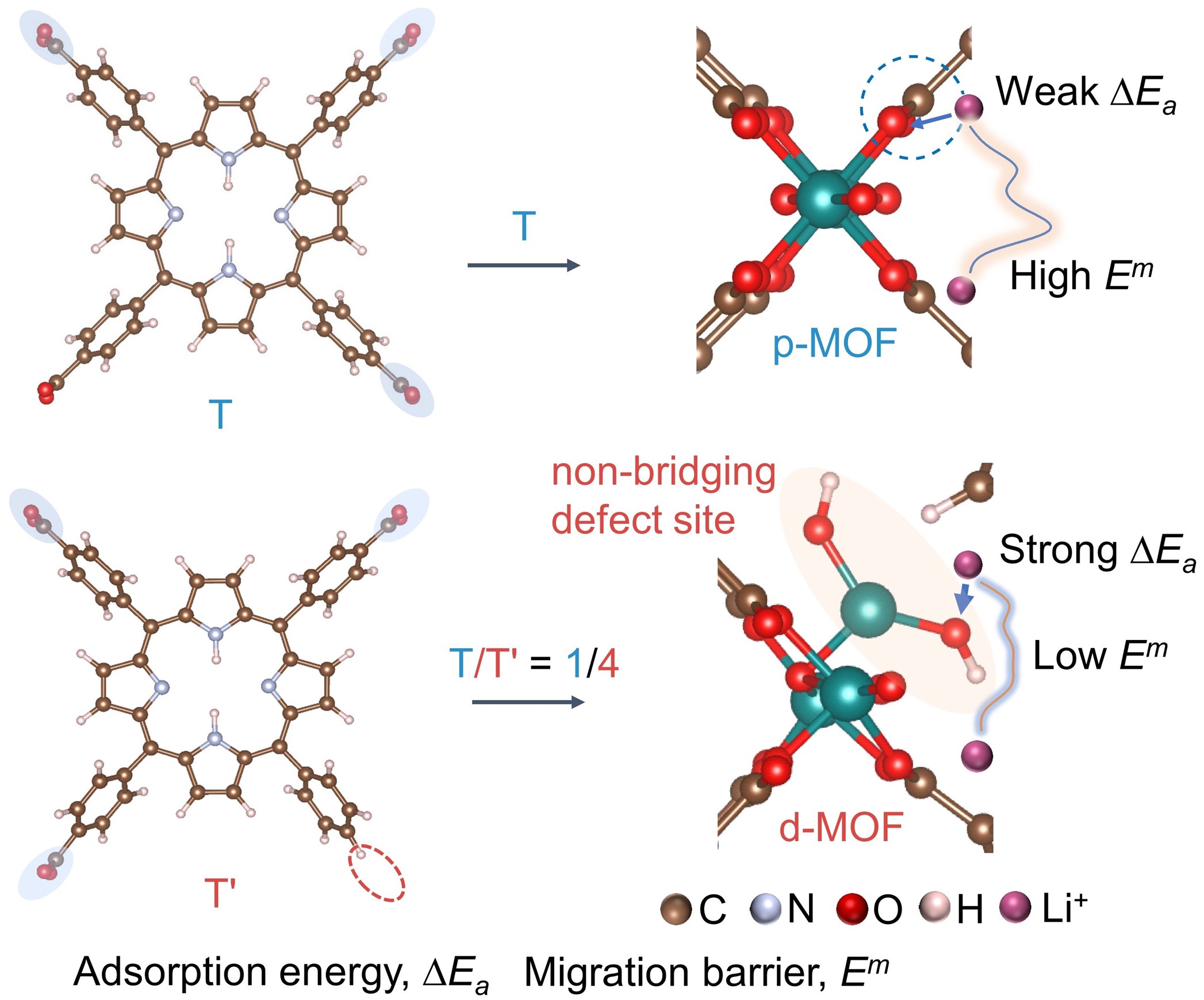 近几十年来,锂离子电池(LIBs)已广泛应用于消费电子产品和电动汽车等领域,展现了其无可替代的重要性。为了突破传统商用石墨负极材料低的比容量,科研人员正积极寻找新型负极材料。由金属离子和有机配体组成的金属-有机骨架(MOFs)因其多变的拓扑结构和可调的结构特性,在LIBs负极材料方面展现出巨大的应用潜力。然而,传统MOFs中的金属节点和有机配体通常为饱和配位状态,导致其对锂离子的吸附能(ΔEa)和扩散势垒不够理想,限制了Li的结合位点数量。因此,在MOFs中构造易容纳Li的不饱和配位活性位点对于提高储锂容量至关重要。
