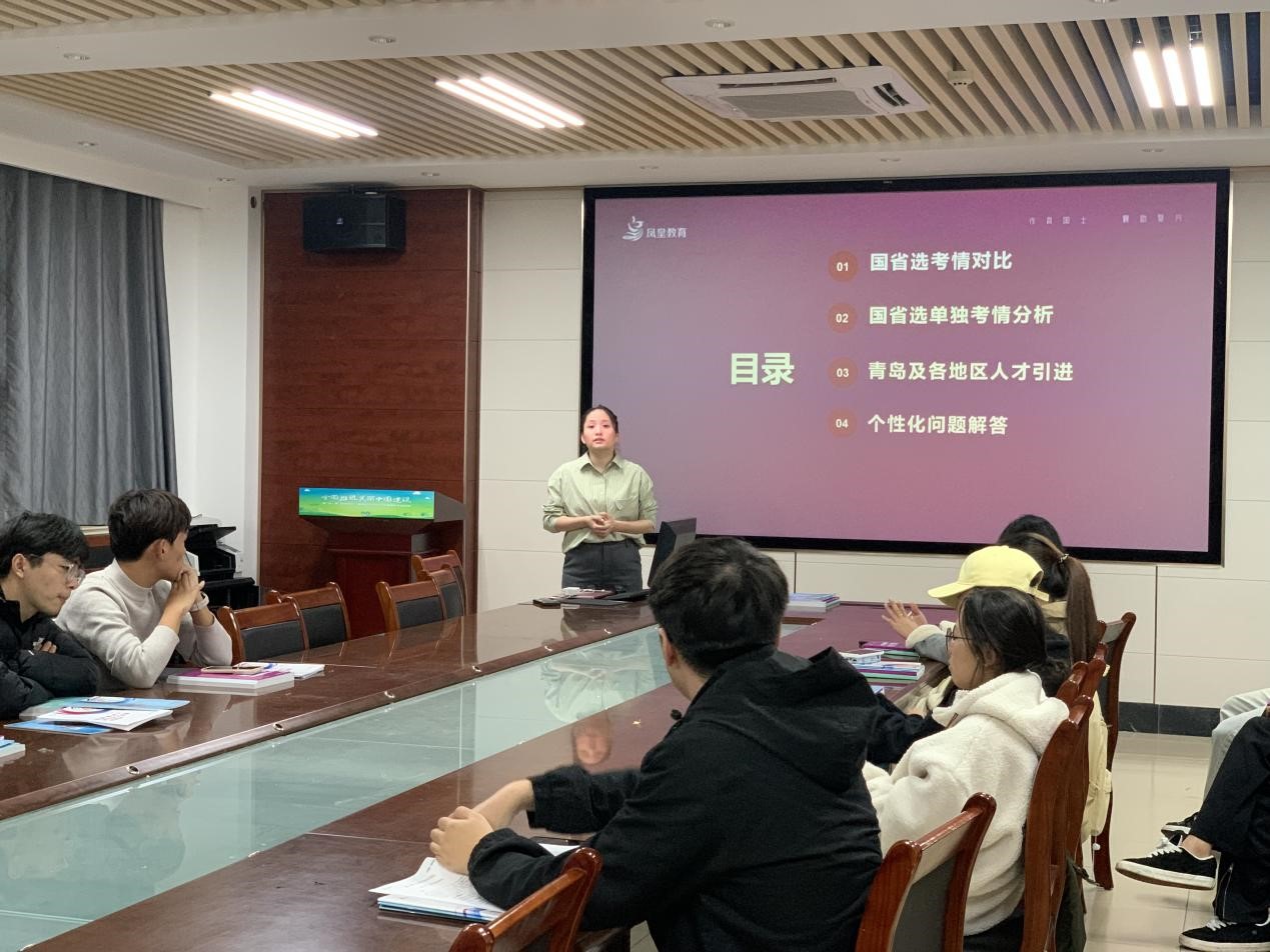 会议伊始,贾慧先展示了2025年公职类考试时间线一览,并对国家公务员、山东省考和山东选调做了简要的对比。紧接着,贾慧就国考、省考以及青岛及各地区人才引进做了详细的介绍。她分别从考试时间、考试内容、报考要求以及针对本院员工可报考的岗位四个方面系统、全面的向同学们讲解了公职类考试的基本情况以及注意事项。会议最后,贾慧鼓励同学们尽早考虑好自己的目标和方向,提前准备公职类考试,并针对同学们提出的问题进行了详细的解答。