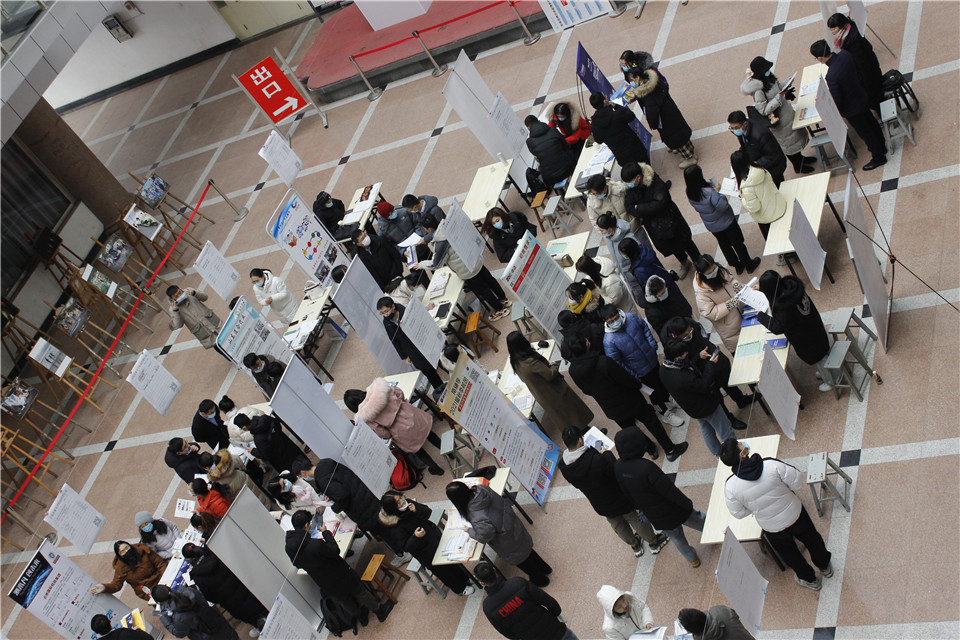 应届毕业生积极向企业投递简历,与企业负责人洽谈,了解企业信息,认真寻找适合自己的工作岗位。部分企业在就业洽谈室进行了面试。