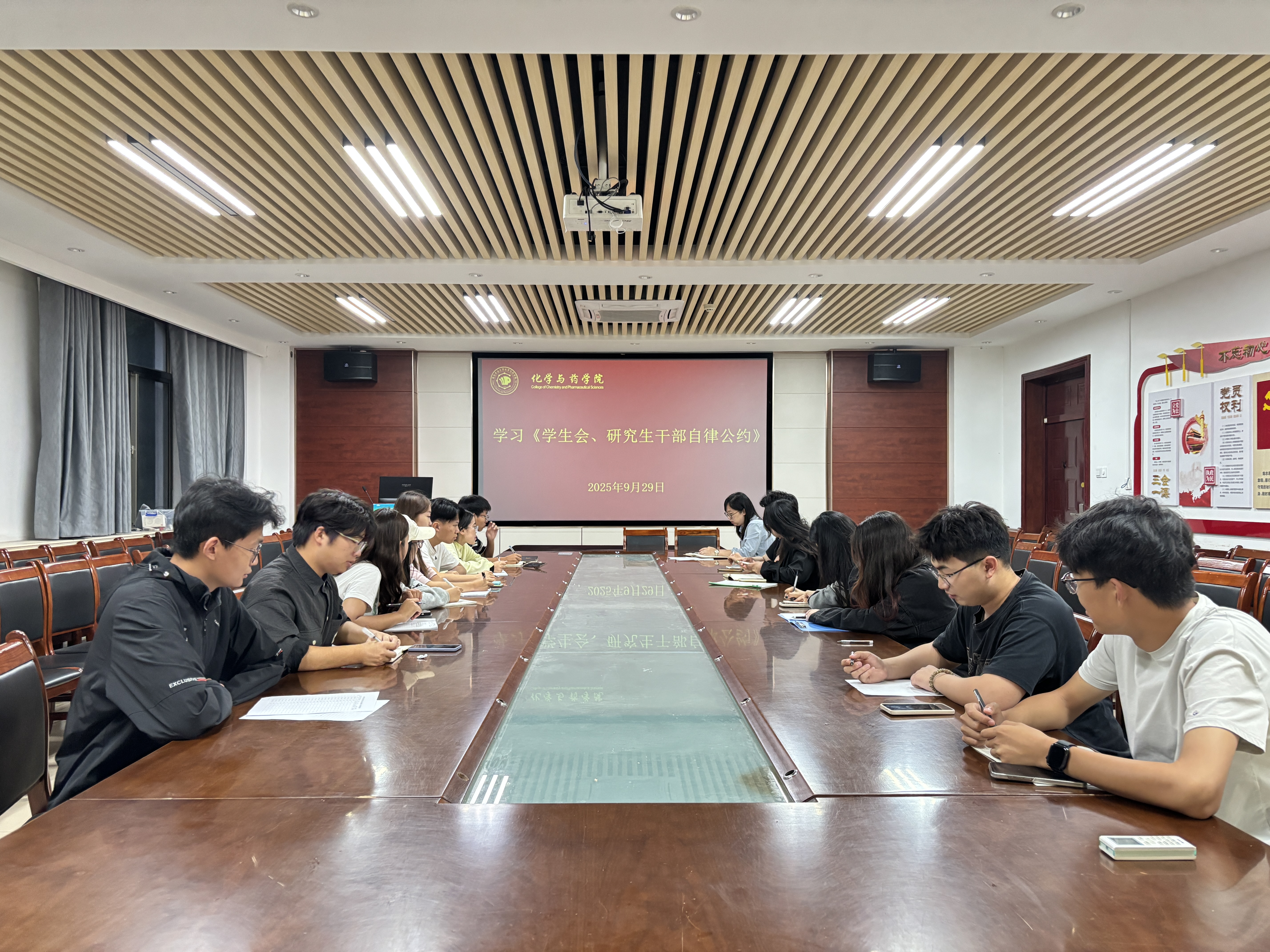 会上,赵莹带领全体员工干部仔细研读《员工会、研究生干部自律公约》,并结合员工工作内容提出两点要求,一是员工干部应严格遵守公约条例,恪守员工本分,强化责任意识,确保工作开展的合理性与方式方法的准确性;二是员工会成员要廉洁自律,努力提升履职能力,始终牢记服务同学的宗旨,真正做到从同学中来、到同学中去,切实发挥桥梁纽带作用。