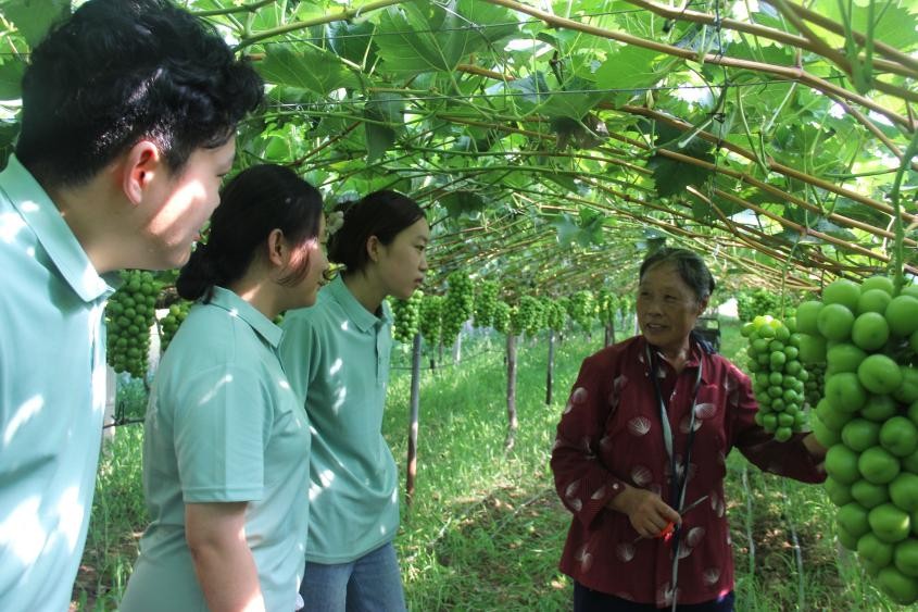 7月26日下午,茂芝场农业产业园的阳光玫瑰葡萄园里绿意盎然。队员们蹲在葡萄架下,与管理人员沟通交流学习种植经验,学习特有的栽培技术。当听到“亩产收益能到三万元”时,大家纷纷感叹科技对农业的赋能作用。实践团成员纷纷表示,乡村振兴需要‘新农人’,更需要新知识。