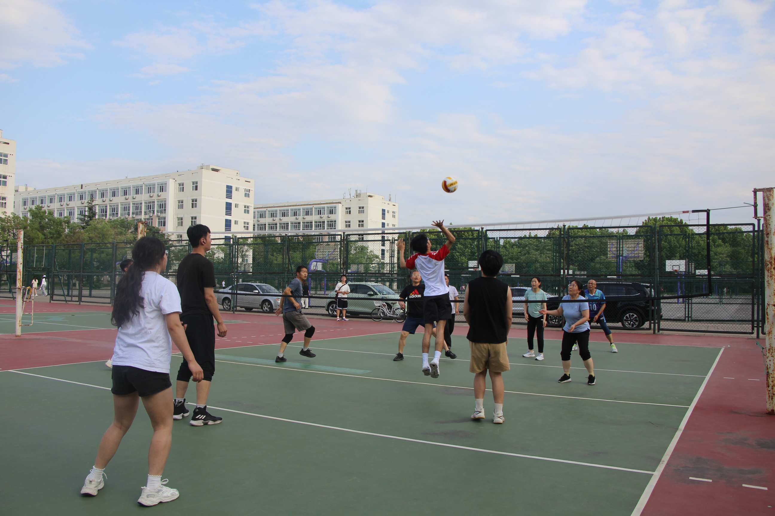 赛前,师生们进行热身互动,相互对练传球,调整状态,排球场洋溢着轻松愉快的氛围。随着比赛哨声响起,双方队员迅速投入状态。赛场上,毕业生们活力四射,老师们同样身手不凡,展现出极高的热情和竞技水平,双方实力相当,比分交替上升,队员们灵活应变,配合默契,每一次精彩的进攻与防守都引来阵阵喝彩。场上精彩对决,场外热情助威,处处充满了运动带来的欢乐。最终,比赛在师生们的欢声笑语中圆满落幕。