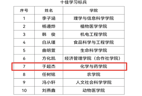 于超杰以优异的专业成绩,丰富的科研竞赛经历获评“十佳学习标兵”荣誉称号。他以持之以恒的学习态度、孜孜不倦的探索精神,用专注和勤奋为笔,在学术之路上稳步前行。