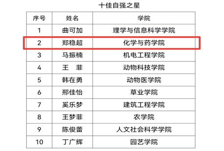 郑稳超以优良的学习成绩,丰富的社会实践经历评选为“十佳自强之星”荣誉称号。面对生活的挑战,他始终保持乐观积极的心态,以顽强的毅力克服困难,在追求学业进步的同时热情回馈社会,用实际行动诠释新时代青年矢志奋进的坚韧品格。