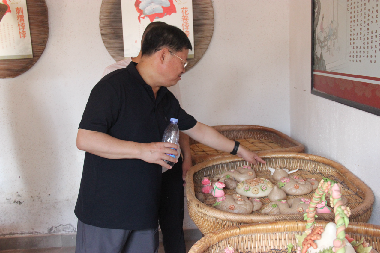 公司老师们同实践团成员来到面食文化博物馆,共同体会胶东地区深厚的面食文化底蕴。面食记忆馆内,由面团塑造的一个个小人、生肖以及各种动画IP,色彩艳丽、生动有趣,传统技艺与现代艺术的碰撞,让实践团领略非遗的魅力。小麦长歌展区内,收割小麦的石铲刀,小麦播种用的点葫芦,收储小麦用的升、斗等农作工具,无不体现了胶东先民耕作过程中的勤劳和智慧。在参观过程中,王进国拿起手中的竹篮向实践团成员讲述它背后的故事,让年轻学子们体会到这些农具承载着土地记忆与温度。来到七巧工坊,于博清向师生们介绍造型各异的巧饼也同样蕴含了当地人民的对未来的向往,有新生儿三日送“喜面”、百日蒸“百岁馒头”,老人过寿要用“九桃一手”,盖新房要“狮虎把门,金龙绕梁”,让实践团成员真切感受到了面团背后“蒸蒸日上”的民生。