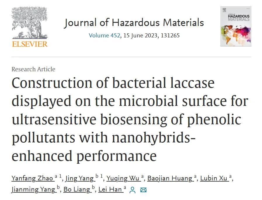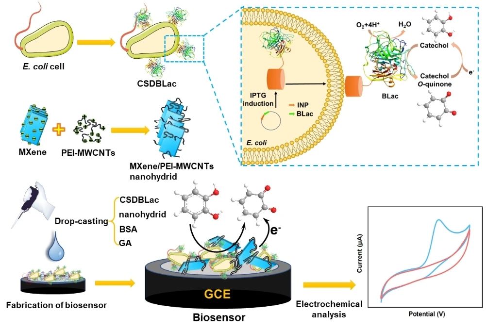 尽管细菌漆酶(BLac)具有发酵周期短、对温度和pH变化适应性强等优点,但由于BLac的细胞内分泌和电子传递效率低,将其用于制备生物传感器仍然具有一定的挑战性。我们通过微生物表面展示技术,成功构建了细胞表面展示的细菌漆酶(CSDBLac)作为全细胞生物催化剂,不仅消除了传质限制,还简化繁琐的纯化步骤。同时,设计了MXenes/PEI-MWCNTs纳米杂化物来固定CSDBLac并提高其电催化活性,成功构建了一种电化员工物传感器来检测常见的酚类污染物(图1)。本工作创新性地将BLac和纳米杂化物作为生物传感器的核心元件,不仅有效地解决了BLac在生物传感器上的应用瓶颈,而且极大地提高了全细胞生物催化剂与电极之间的电子转移效率,显著提高了酚类生物传感器的性能。该方法对于从源头上显著提高酚类及其它生物传感器性能具有重要意义。