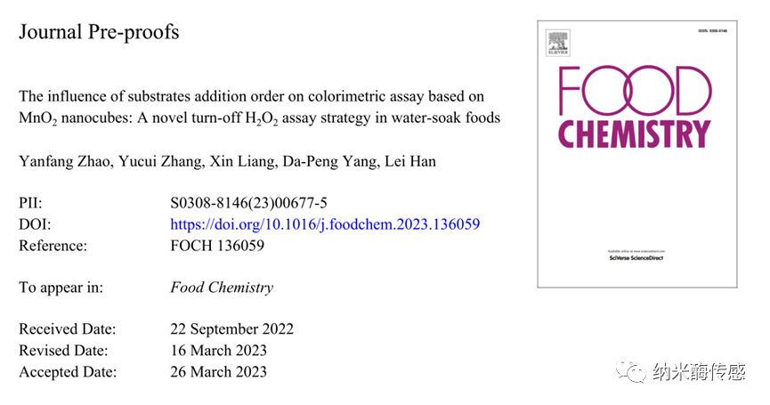 相关成果以" The influence of substrates addition order on colorimetric assay based on MnO2 nanocubes: A novel turn-off H2O2 assay strategy in water-soak foods"为题发表在国际学术杂志Food Chemistry上。