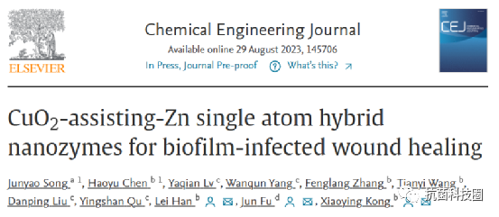 近期,bw西汉姆联孔晓颖副教授团队,韩磊教授团队、中山大学付俊教授合作在期刊《Chemical Engineering Journal》上发表了用于生物膜感染伤口愈合的 CuO2 辅助Zn单原子杂化纳米酶的文章。单原子催化剂(SAC)的特点是原子上分散着单个金属原子,由于其催化活性令人满意,因此比普通的纳米酶材料具有更优越的抗菌性能。然而,当用于治疗受生物膜感染的伤口时,由于活性氧(ROS)供应不足,单原子催化剂仍无法有效解决严重的微生物感染问题。本文制备了一种由Zn单原子催化剂和过氧化铜组成的新型杂化纳米材料(Zn SACs@CuO2),以实现ROS生成的升级和对生物膜感染伤口的光热/化学动力(PTT/CDT)联合治疗。具体而言,CuO2 不仅具有优异的光热特性,还具有产生 H2O2 和 Fenton 类催化活性,这有助于 Zn SACs 加速内源性和外源性 H2O2 的 ·OH 转化。与 Zn SACs 的单一抗菌策略相比,Zn SACs@CuO2 杂化纳米酶在破坏生物膜、激活免疫和改善炎症方面表现出更强的治疗效果。总之,这项研究开发了一种杂化单原子 纳米酶材料,可用于生物膜感染伤口的高效愈合。