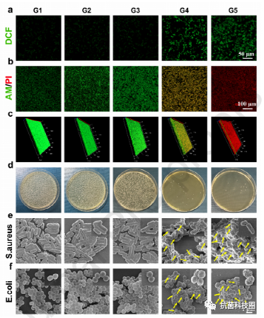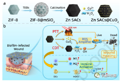 要点二:抗菌机理:碳(C)和铜(Cu)作为 PTT 剂,具有很高的光热 转化效率高的 PTT 药剂,从而实现高效的 PTT 抗菌疗法。同时,在酸性伤口微环境下,CuO2 被可逆地分解为 Cu2+ 和 H2O2,随后金属活性位点(Zn SACs 和 Cu2+)与 H2O2 发生高效的过氧化物反应,生成高毒性 ·OH 用于 CDT 抗菌治疗。更重要的是,Zn SACs@CuO2 杂化纳米酶能很好地愈合生物膜感染的伤口,从根除细菌感染、缓解炎症和激活免疫系统中获益。