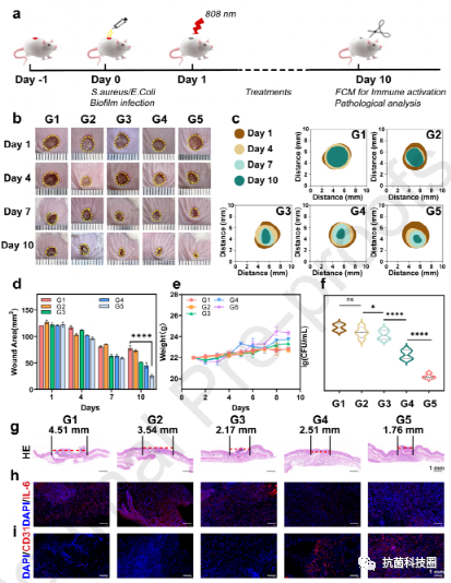 2)Zn SACs@CuO2 杂化纳米酶令人满意的抗菌效率促进了生物膜三维结构的瓦解,并在体内治疗过程中迅速改变了伤口组织的炎症过程,改善了免疫微环境、 进一步加速伤口愈合。