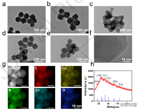要点一:材料设计:在这项研究中,作者通过将 MOF 衍生的锌单原子与 CuO2(Zn SACs@CuO2)修饰在一起,制备了一种近红外响应杂化纳米酶系统,用于 PTT/CDT 协同抗菌治疗(方案 1)。Zn SACs 是通过表面保护热解策略从具有代表性的 MOF 前体沸石咪唑酸框架-8(ZIF-8)中获得的。此外,最终的 Zn SACs@CuO2 杂化纳米材料是在含有 CuCl2、H2O2 和氢氧化钠的水反应溶液中简单合成的,其中 Zn SACs 作为前驱体,聚乙烯吡咯烷酮(PVP)作为稳定剂来修饰 CuO2 的表面并控制其粒径(图 1a)。