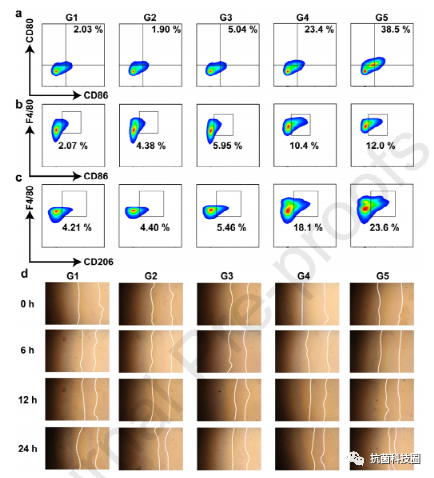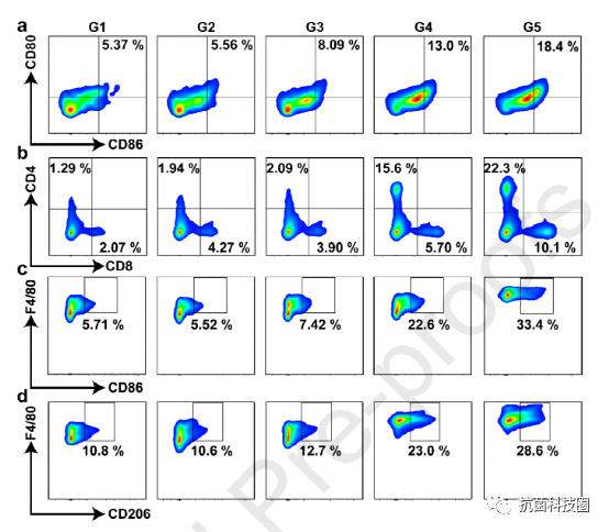 图 7. Zn SACs@CuO2 NPs 在体内的免疫激活作用。(a、b、c、d)成熟 DC、CD4+T 细胞、CD8+T 细胞、M1 型巨噬细胞和 M2 型巨噬细胞的流式细胞术。组别:(G1)对照组,(G2)H2O2+近红外组,(G3)Zn NPs+H2O2+近红外组,(G4)Zn SACs+H2O2+近红外组,(G5)Zn SACs@CuO2+H2O2+近红外。激光:808 纳米,5 分钟,1 W·cm-2 。