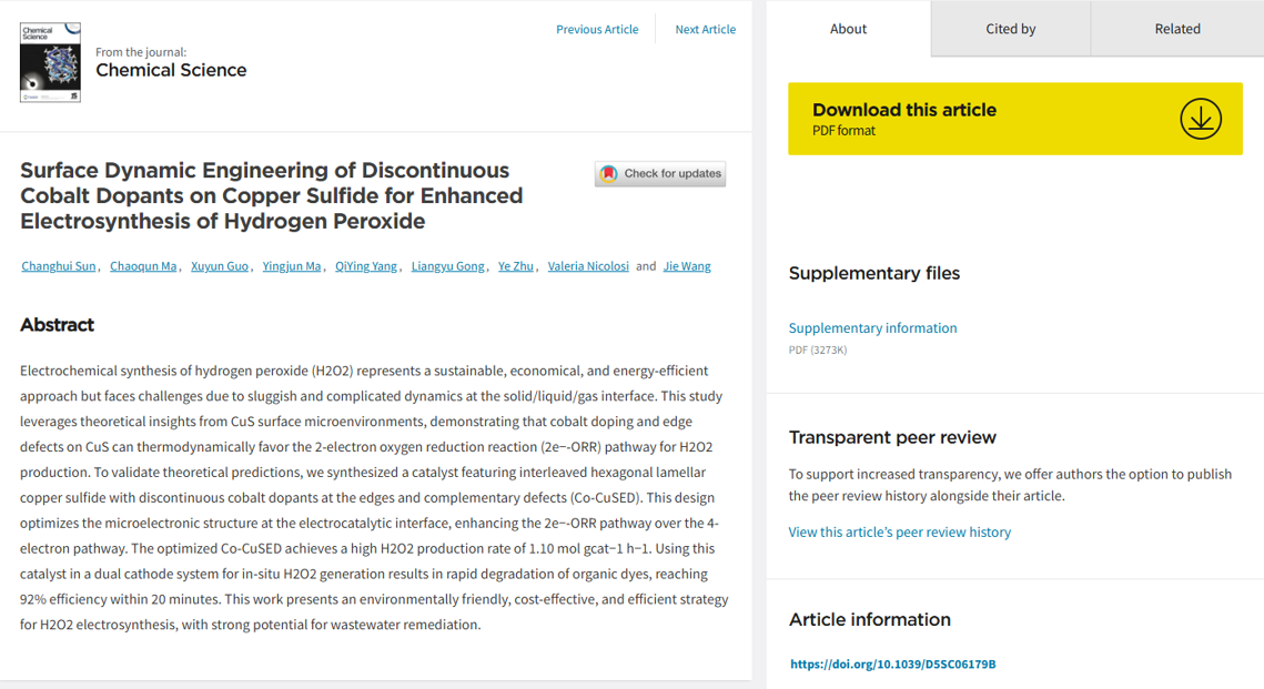 电化学合成过氧化氢(H2O2)是一种可持续、经济且节能的方法,但由于固/液/气界面动力学缓慢且复杂仍面临诸多挑战。该研究基于硫化铜(CuS)表面微环境的理论探讨,提出硫化铜中的钴掺杂和边缘缺陷在热力学上有利于二电子氧还原反应(2e−-ORR)途径,从而促进H2O2的生成。为了验证理论预测,该团队成功合成了具有交错排列的六边形层状硫化铜结构催化剂,且催化剂片层边缘分布着不连续的钴掺杂剂和互补缺陷(Co-CuSED)。这种设计优化了电催化界面的微电子结构,提高了2e−-ORR选择性。优化后的Co-CuSED催化剂实现了高达1.10 mol gcat−1 h−1的H2O2产率。此外,在双阴极系统中使用该催化剂进行原位H2O2生成,实现了有机染料的快速降解,20分钟内效率达到92%。该成果提出了一种环保、经济且高效的H2O2电合成策略,在废水处理方面具有巨大潜力。