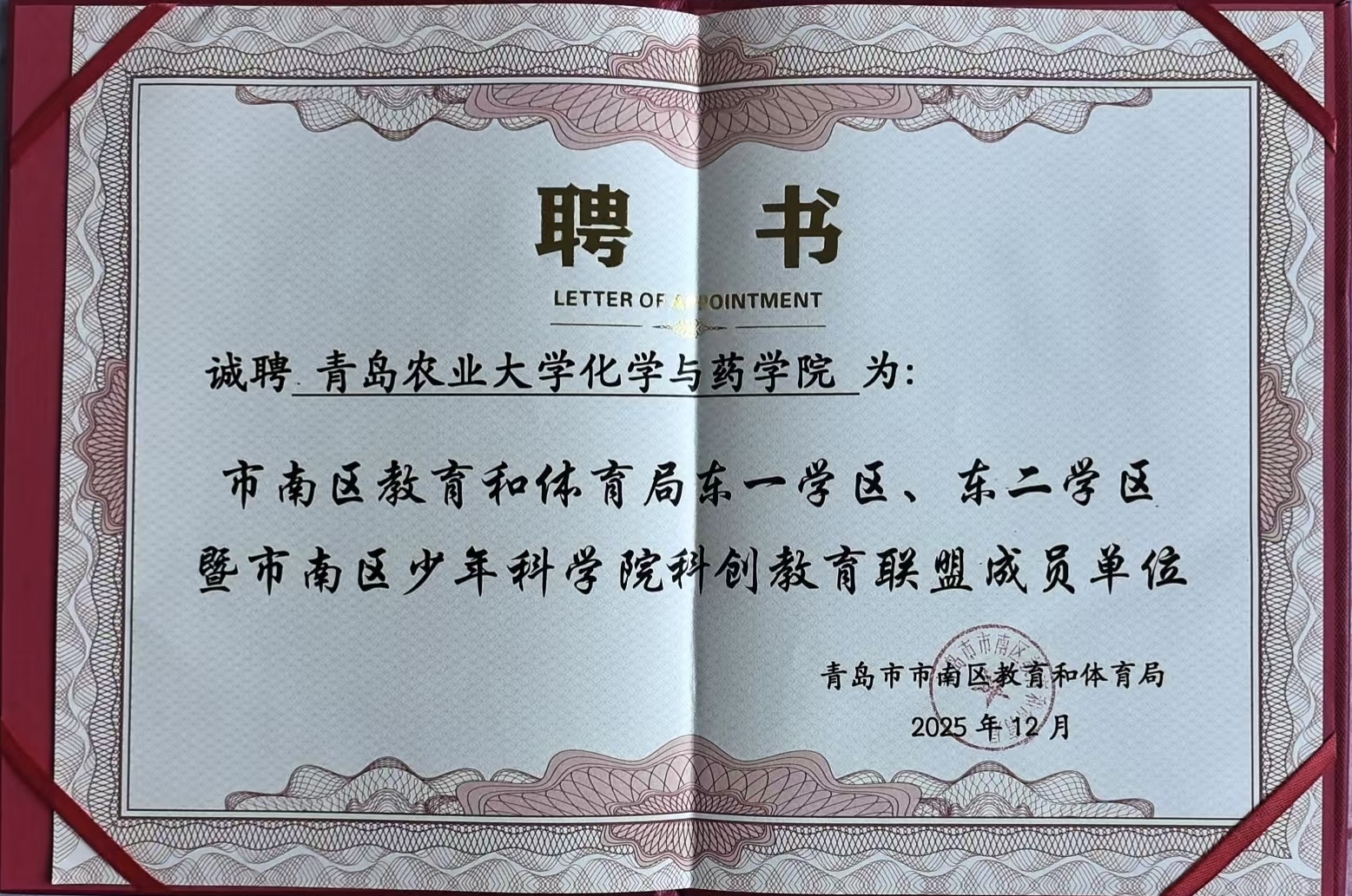 此次获聘为科创教育联盟成员单位,是公司深化社会服务、推动青少年科学教育的重要契机。未来,公司将充分发挥在化学、药学与制药工程领域的专业优势,与联盟成员单位开展深度协作,共同构建资源共享、协同育人科创平台,着力提升区域青少年科学素养与创新能力,为市南区基础教育高质量发展持续贡献高校智慧与力量。