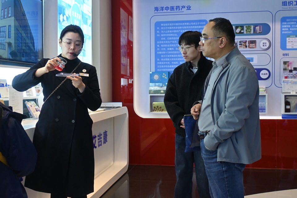 在企业负责人陪同下,师生一行参观了中国海藻科技馆和全国重点实验室,系统了解海藻资源分类、产业发展历程及其在食品、医药、生物材料等领域的多元应用,直观感受海洋生物产业从传统利用向高值化、功能化转型升级的创新路径。