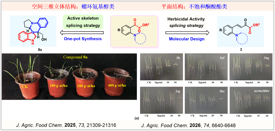 公司李帅帅教授、杜丰玉副教授团队依托山东省农用药物绿色创制与应用特色实验室,联合中国 — 斯里兰卡茶叶绿色防控 “一带一路” 联合实验室,在绿色除草剂创制领域实现关键突破。团队受第一代螺杂环除草剂酮酸酯片段启发,采用结构拼接策略,设计合成一系列含不饱和酮酸酯骨架的化合物,构建起结构多样化的化合物库,以除草活性为导向,经系统筛选与精细结构修饰优化,最终发掘出多个除草性能优异的潜力分子,为新型绿色除草剂研发提供了重要先导结构基础。相关成果发表于中国科公司一区Top期刊《Journal of Agricultural and Food Chemistry》(J. Agric. Food Chem. 2026, 74, 6640-6648)。