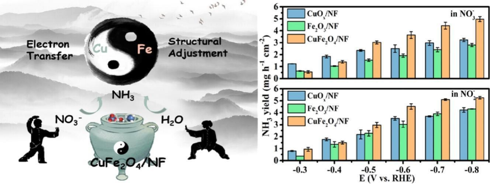 山东省农用药物绿色创制与应用特色实验室李帅帅教授、颜世海副教授在电催化氮污染物资源化与绿色合成氨领域取得关键突破,相关成果在线发表于国际化工领域权威期刊《Chemical Engineering Journal》, (中国科公司一区top期刊, 2026, 533, 174931)(IF=13.2)。氨作为我省农业氮肥与工业基础原料,既保障粮食生产,又助力绿色环保与低碳转型,而绿色合成氨技术更是精准赋能农业生产的关键支撑。推广该技术可以有效降低能耗与排放,提升产业竞争力,对夯实粮食安全根基、推动山东经济高质量发展具有重要意义。传统哈伯法合成氨存在高能耗、高碳排放的弊端,电催化硝酸盐/亚硝酸盐还原制氨技术可同步实现水体氮污染治理与绿色低碳氨合成,但现有催化剂普遍存在活性低、稳定性差、反应能垒高、转化效率偏低等行业瓶颈。针对这一难题,团队首次设计制备了泡沫镍负载的珊瑚状CuFe₂O₄纳米阵列催化剂,通过构建原子级分散的Cu–Fe双活性位点实现电荷分布与材料结构的协同调控,在碱性体系中展现出优异的催化性能,同时兼具优异的产物选择性与长期稳定性。该催化剂还应用于Zn-NO₃⁻/Zn-NO₂⁻电池体系,实现污染物治理与清洁能源产出的协同耦合,为水体氮污染治理与绿色合成氨技术发展提供了全新的解决方案。