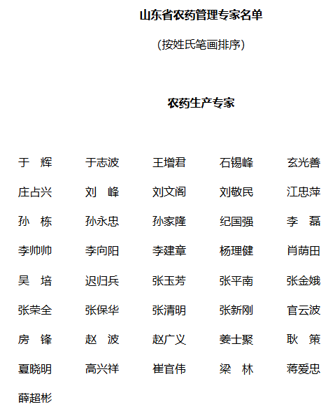 为进一步提高农药管理工作的科学性,充分发挥专家在农药生产经营许可审查、行业指导、技术创新、安全生产等工作中的作用,山东省农业农村厅遴选出农药管理专家97名,其中农药生产专家41名,任期三年。