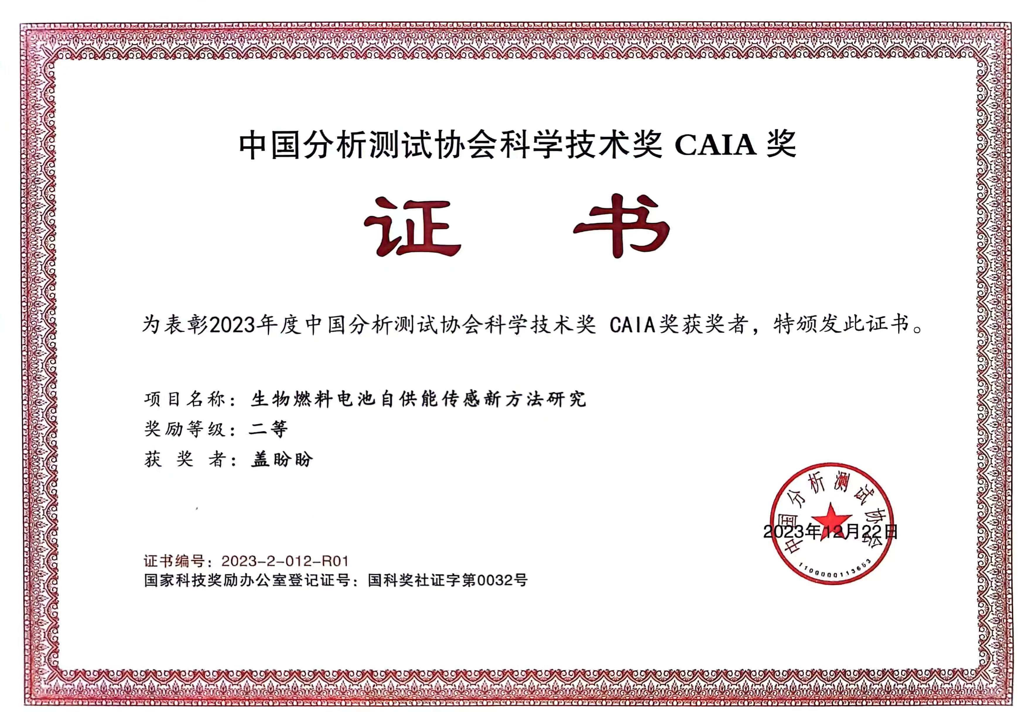 祝贺《生物燃料电池自供能传感新方法研究》项目荣获2023年度中国分析测试协会科学技术奖CAIA奖二等奖,项目主要完成人为盖盼盼、谷成成、李峰