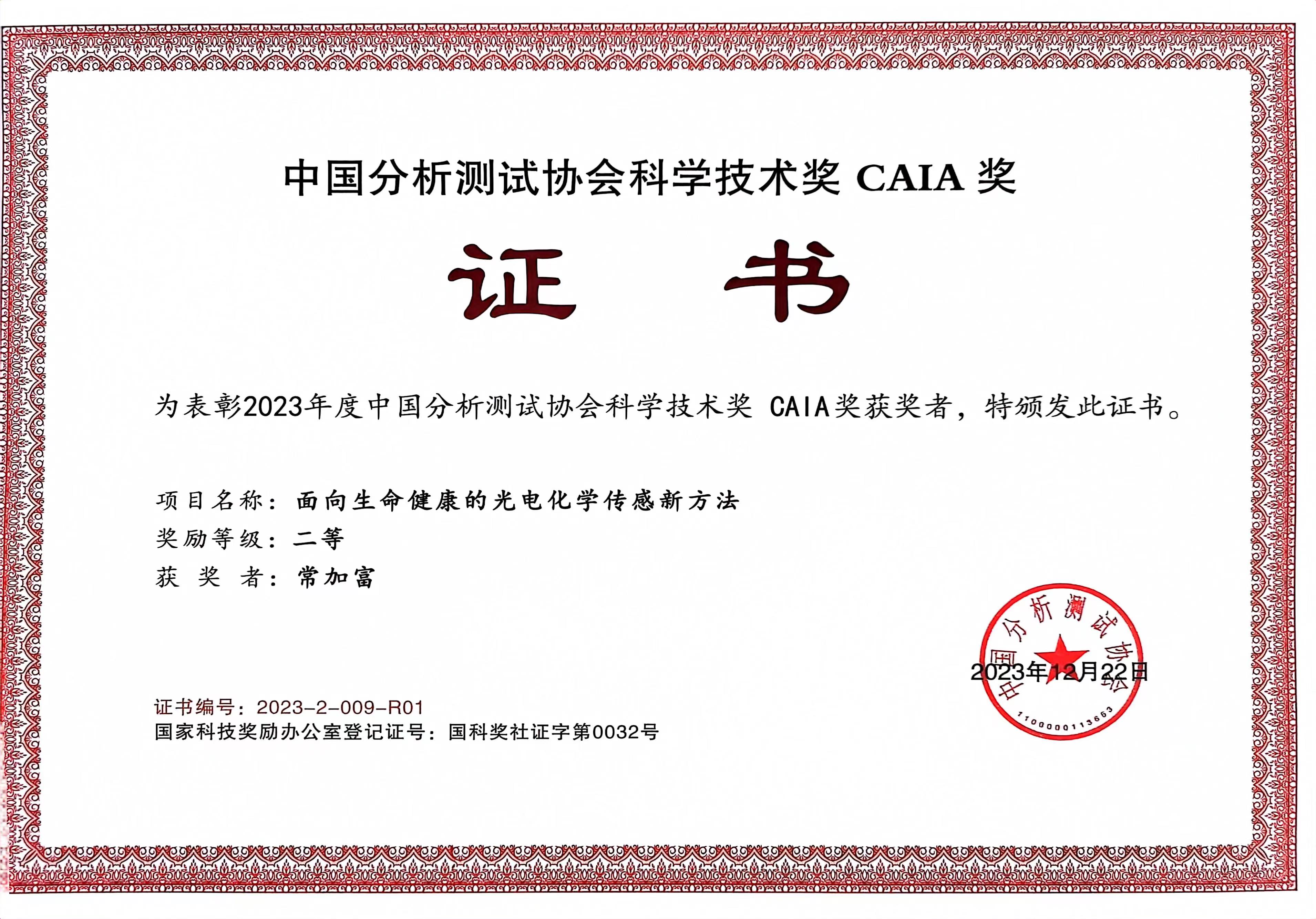 祝贺课题组荣获2023年度中国分析测试协会科学技术奖CAIA奖