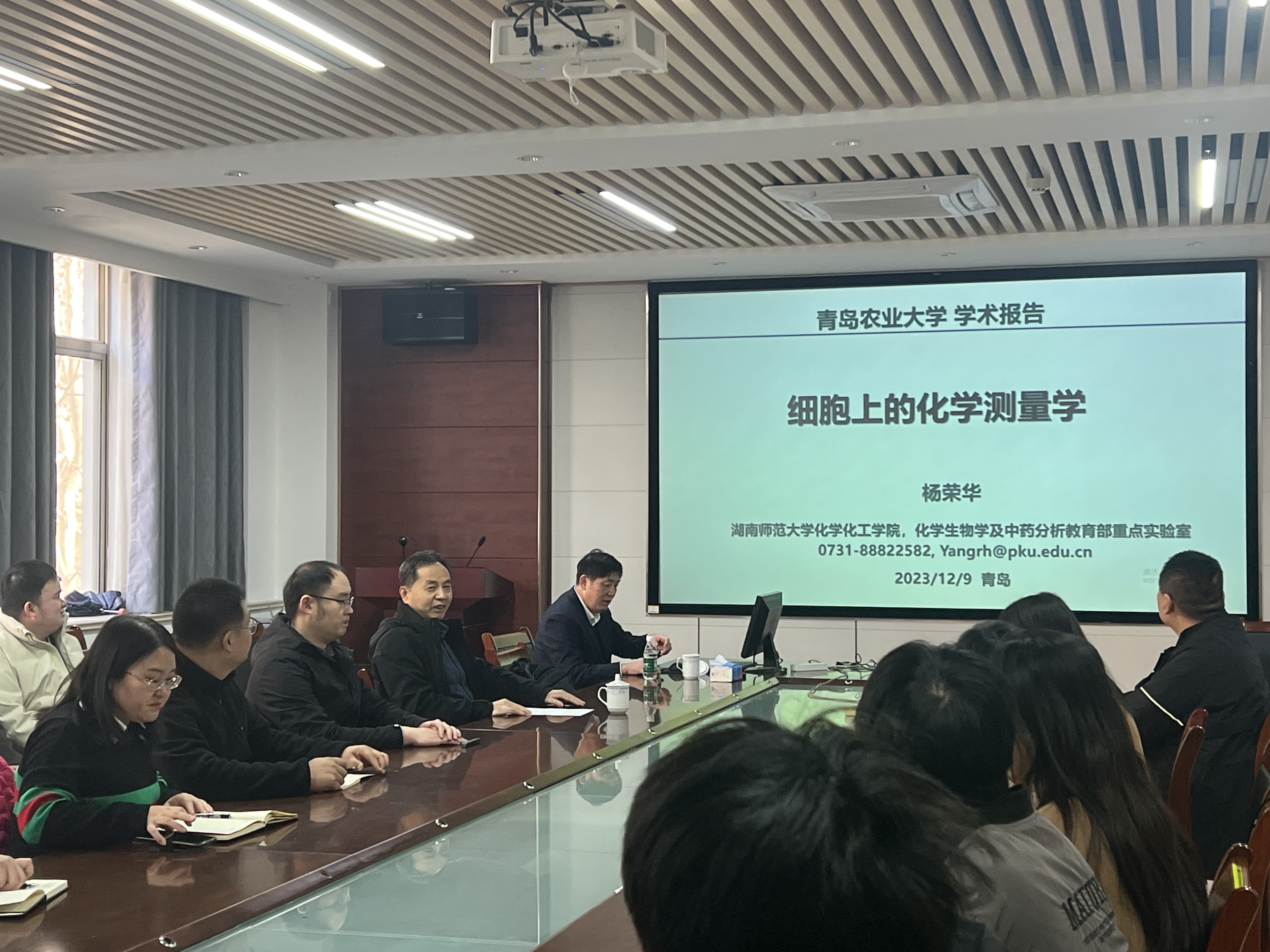 2023年12月8日,课题组邀请湖南师范大学杨荣华教授到课题组指导工作,并作了题为《细胞上的化学测量学》的精彩报告。