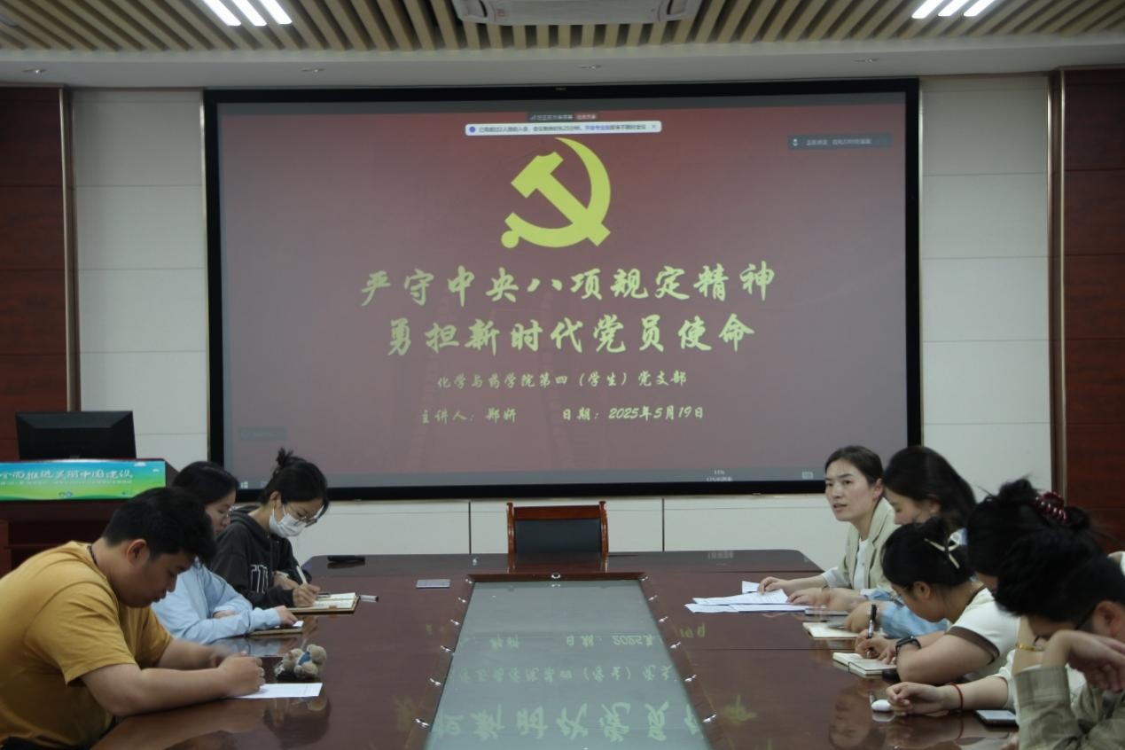 公司第四(员工)党支部组织委员郑妍开展“严守中央八项规定精神,勇担新时代党员使命”专题党课,结合员工党员实际,提出要深刻领会中央八项规定精神的时代价值,全体党员要在日常学习生活中养成优良习惯,以优良作风发挥模范作用,以实际行动践行纪律要求。