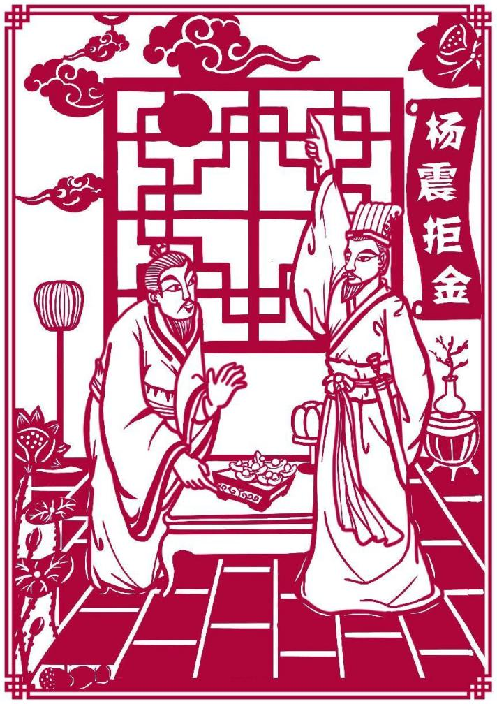 杨震拒金:东汉人杨震去东莱上任时路过昌邑,昌邑县令王密是杨震任职荆州刺史时举荐过的官员。王密听说杨震路过,为报答当年提携之情,白天空手去见了杨震,晚上则准备了十斤金子想送给杨震。王密说:“现在是深夜没有人知道。”杨震却说,“天知、地知、我知、你知,怎么能说没有人知道呢?”王密听后很惭愧。杨震为官清廉,有老朋友、长辈劝他为子孙购置产业,杨震说:“让以后的世人称他们是清官的子孙,我用这个留给他们,不是也很丰厚吗?”在杨震言传身教下,五个儿子生活简朴、为官清廉,以“清白吏”而誉满天下。