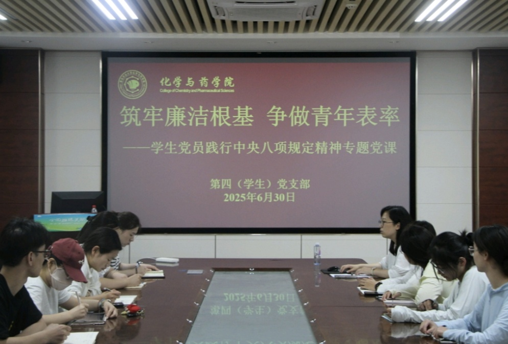 作风建设关乎党的形象与事业成败,青年党员的廉洁自律更是党风建设的重要基石。为深入贯彻中央八项规定精神学习教育,引导员工党员筑牢廉洁自律根基,6月30日,公司第四(员工)党支部于化学楼207会议室开展“筑牢廉洁根基,争做青年表率”专题党课,公司团委书记赵莹主讲,第四(员工)党支部全体成员参加。