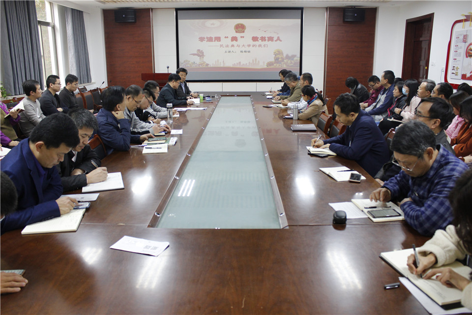 报告中,陈锦铭指导教职工们学法用“典”,学会运用民法典解决生活中的实际问题,并从教育工作的角度指出民法典的要求和作用。陈锦铭指出,民法典的颁布和执行,是国家推动全面依法治国的重要保障,作为高校教职工,要充分学习、理解和作用这一法典,随后陈锦铭从七个角度对民法典进行了讲解,一是人格,主要为民事主体的人身自由及人格尊严问题;二是家,实现家和万事兴;三是财产,要平等保护,不得侵犯;四是人与人,遵守自愿、平等、公平的原则;五是人与国家,国家不越位、不缺位;六是人与自然,应当和谐共处;七是侵权责任,侵权需担责。陈锦铭还提到,全体教职工应当学法用“典”,教书育人,重视对员工人格权的保护,履行责任和义务,预防校园伤害事故的发生。此外,他提醒老师们要关注合同行为与财产使用,像员工传授法制知识,培养员工良好美德。